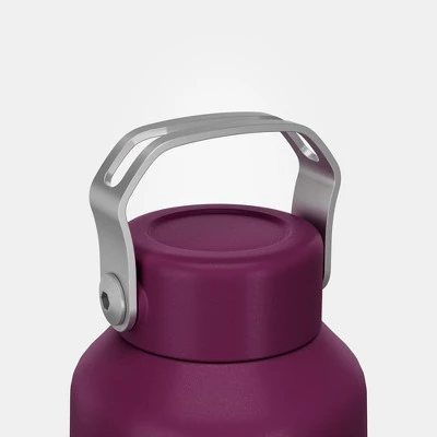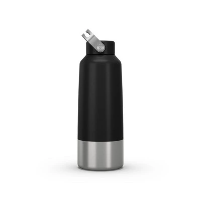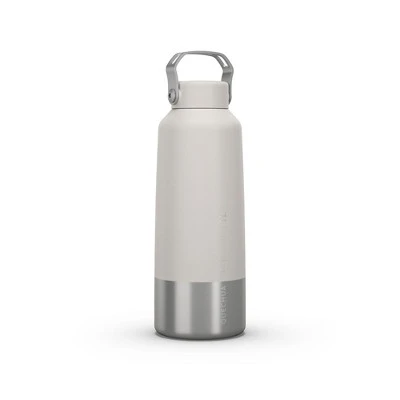 The Quechua MH100 stainless steel screw top hiking water bottle holds 34 ounces total and comes in three color choices: plum, carbon gray, and putty. The stainless steel design makes this water bottle extremely durable and strong enough to withstand bumps and drops that come with hiking outdoors. The screw cap is easily removable and just as easily screws back on with one quick turn.The bottle also features a large carry handle and a wide spout to make refilling the bottle much easier. The stainless steel is food-grade but not isothermal and it doesn’t leave a metal aftertaste. To keep your drink cool, it’s recommended to purchase the 1 L isothermal cover, sold separately.