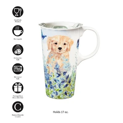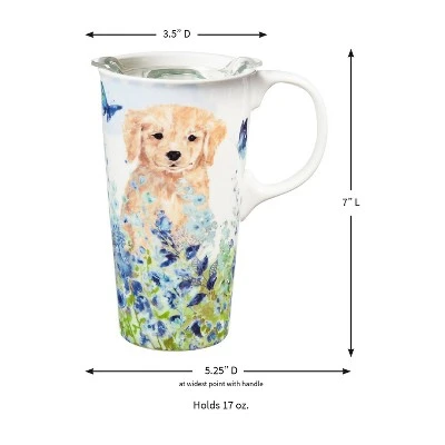 This 17 oz. ceramic travel cup comes with a slide closure Tritan lid and a matching gift box. It has a white handle. The mug features an illustration of a puppy dog in a floral meadow looking at a blue butterfly. Microwave & dishwasher safe, remove top. At Evergreen, we are committed to producing premium, quality products to bring a touch of color and personality to your home. We respect and celebrate the uniqueness in everyone by offering one of the world’s largest selections of home and garden decor.