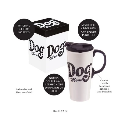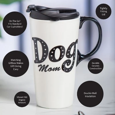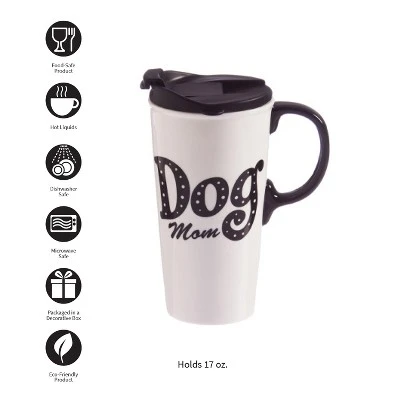 This ceramic travel cup is white with “Dog Mom” in black and white polka dot typography with gift box. The 17 oz. mug is top rack dishwasher safe and it fits in most car cup holders. It has a handle and a leak-free lid with 3 rings of silicone. At Evergreen, we are committed to producing premium, quality products to bring a touch of color and personality to your home. We respect and celebrate the uniqueness in everyone by offering one of the world’s largest selections of home and garden decor.