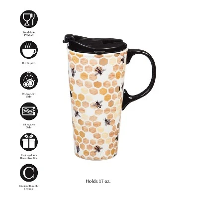 This 17 oz. ceramic travel cup comes with a flip top black lid and a matching gift box. It has a black handle. The mug features a wood colored honeycomb with bees buzzing around the pattern. Microwave & dishwasher safe, remove top. At Evergreen, we are committed to producing premium, quality products to bring a touch of color and personality to your home. We respect and celebrate the uniqueness in everyone by offering one of the world’s largest selections of home and garden decor.