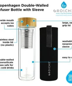 The GROSCHE VENICE glass water bottle is a convenient and stylish way to stay hydrated while helping to keep single use plastic bottles at a minimum. We are consuming 100,000,000 single use plastic bottles per minute, and over 91% of them are not recycled. The VENICE is a reusable alternative to that and since its made from high grade borosilicate glass its a stylish way to stay hydrated.This eco-friendly water bottle is made of borosilicate glass that is safe for hot & cold drinks. It has a natural bamboo lid with stainless steel inside the lid and no plastic. This water bottle has a convenient 22.6 fl. oz. capacity and a wide mouth to make it easy to drink from. The eco friendly lid is made of natural and renewable bamboo, has a stainless steel cap on the inner part of the lid and has a silicone seal that makes it leak proof. The bottle comes with a protective and insulating washable neoprene sleeve that will help keep your hot beverage warm or cool around 2x longer than ordinary glass water bottles. It’s all of these features and more that make the VENICE water bottle with Sleeve a classic and eco friendly water bottle that’s great for every day use at home or on the go. Its BPA Free and easy to clean. Hand washing is recommended though for the bottle and bamboo lid. The protective insulating sleeve is machine washable.Every time you buy a GROSCHE Coffee or Tea Product you’re providing 50+ days of safe water to people in need via the GROSCHE Safe Water Project. GROSCHE is a social enterprise and a certified Benefit corporation on a mission to help those without safe water, and funds its efforts with the sale of its coffee, tea, and hydration products. It makes a great gift idea as well – Its the gift that gives back.
