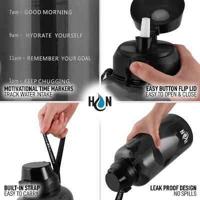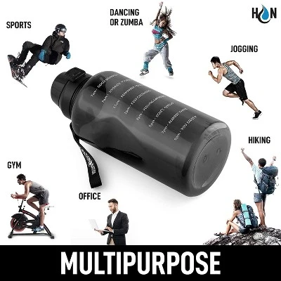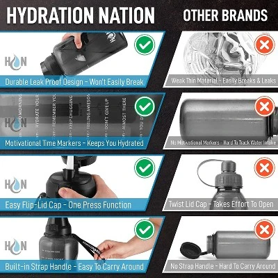 It’s time to set your goal on staying fully and regularly hydrated with the Hydration Nation 1 Gallon water bottle. With a capacity of 128 ounces, it holds enough for your water intake throughout the day. It also comes with a detachable white straw and built-in polyester strap. The bottle itself is made of 100% BPA free high-quality Tritan material that is lightweight, transparent, and durable. It has a length of 13.5 inches, 5.5 diameters at the bottom, and a 3.15 mouth diameter that makes refilling and cleaning convenient and easy. If you take this water bottle in your office, it will be a definite conversation piece. Leak Proof Design – Flip-Top Button Cap Prevents Leaks When Closed, Detachable Straw Easy To Drink & Clean, Wide Mouth Easy To Refill & Add Ice Cubes, Motivational Time Markers Helps Track Water Intake, Built-In Strap Easy To Carry. 1 Gallon Capacity – (13.5″x3.15″), BPA Free, Leakproof, Flip Cap Lid, Hand Wash Only. Motivational Time Markers Track Water Intake, Easy Button Flip Lid Easy to Open & Close, Built-In Strap Easy To Carry, Leak Proof Design No Spills. Multipurpose – Sports, Dancing or Zumba, Jogging, Hiking, office, Gym. Removable Straw – Can Be Used With Or Without The Straw, Easy To Detach For Cleaning Purposes. Hydration Nation – Durable Leak PPProof Design – Won’t Break Easily, Motivational Time Markers – Keeps You Hydrated, Easy Flip-Lid Cap – One Press Function, Built-In Strap Handle – Easy To Carry Around. Other Brands – Weak Thin Material – Easily Breaks & Leaks, No Motivational Markers – Hard To Track Water Intake, Twist Lid Cap – Takes Effort To Open, No Strap Handle – Hard To Carry Around.