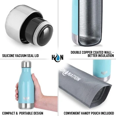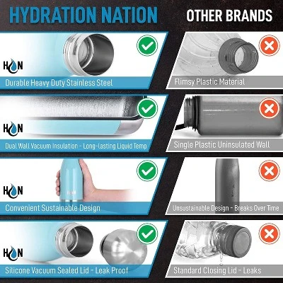 The double-walled vacuum insulation technology combined with leak-proof feature makes the Hydration Nation Stainless Steel Water Bottle the ideal companion for your everyday hydration needs. Reusable and durable construction will surely last for years. Now is the time to ditch the single-use water bottles and switch to a BPA Free water bottle. Comes in a wide variety of fun colors and patterns to choose from! Designed with premium copper vacuum insulation coating, this water bottle is resistant to condensation leaving a sweat-free and cool-to-the-touch exterior at all times. No need for coasters when placing on your table and say goodbye to drips when stored in your bag Enjoy your favorite drink chilled or piping hot for an extended period of time. Perfect for juice, soft drinks, smoothies, protein shakes, coffee, and more! Constructed with precision and top-notch quality fitted and lined leak-proof lid to prevent unwanted spillage anywhere, anytime. You’ll never go out of style with a convenient, strong & fashionable water bottle! Aside from huge design selection, each bottle features fingerprint-free texture for a 24/7 clean and sleek look. Dishwasher friendly but we recommend hand wash for cleaning. Premium Quality 304 Stainless Steel, Durable Construction, Fingerprint Free Texture, Anti- Swat & Anti-Burn with a Leak-Proof Lid.