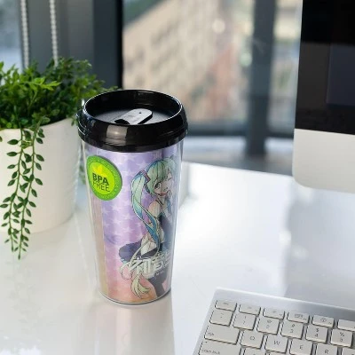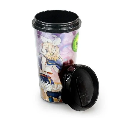 Are you a great fan of the Hatsune Cryton Voice? Here is great Hatsune Miku collectible for you. We bring you a Hatsune future featured travel mug! This mug features Hatsune Miku Crypton design in beautiful colors and reads Hatsune Miku in Japanese attractive fonts. The multi-colored mug is made of high-quality plastic and is heat resistant and comes complete with a screw down lid. The size of the mug is quite spacious and can hold up to 16 ounces of your favorite beverage. It makes a great addition to your Hatsune Miku costume and a perfect gift for any Hatsune Miku manga fan. Don’t soak, hand-wash recommended!