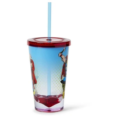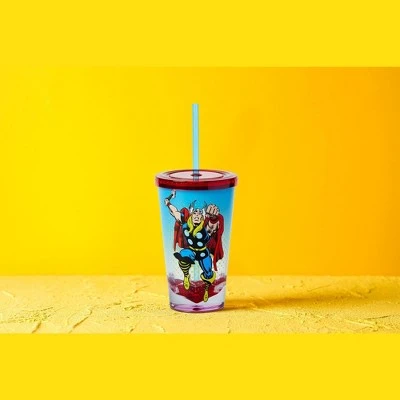 Show off your love of Marvel with this officially licensed carnival cup by Just Funky! Clear plastic cup with red straw and screw down lid holds approximately 19 ounces and features a fun retro image of Thor. Sure to make a great gift for your favorite Marvel fan! Not dishwasher or microwave safe. Hand wash only.