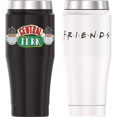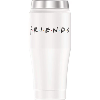 Celebrate your favorite 90s TV show with the Thermos 16 oz. FRIENDS Vacuum Insulated Stainless Steel Travel Tumbler! This tumbler keeps your drinks hot or cold for hours on end so you can enjoy all day long. The exterior stays cool to the touch with hot liquids and sweat-proof with cold. It features a convenient slide lock lid that is easy to open and helps prevent spills or leaks from happening. Suitable for hot or cold beverages. BPA-free materials. Fits most car cup holders.