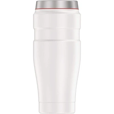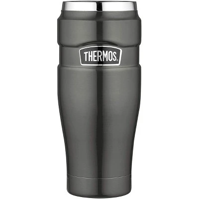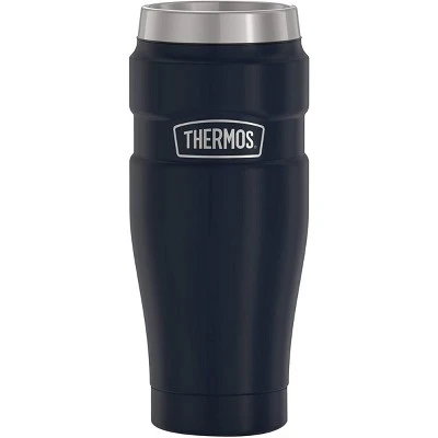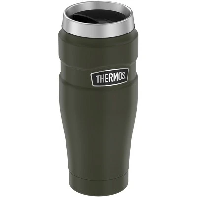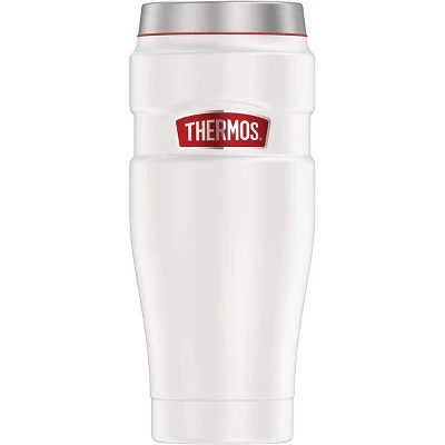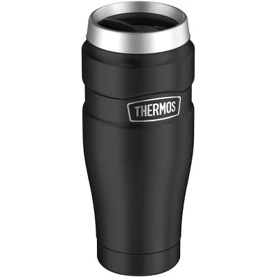 The Thermos 16 oz. Stainless King Vacuum Insulated Stainless Steel Travel Mug is as powerful as it gets. Keep your beverages hot for up to 7 hours or cold for up to 18 hours. The exterior stays cool to the touch with hot beverages and sweat-proof with cold beverages. Combined with the reliable DrinkLock leak-proof lid and built-in hook for brewing tea, this travel mug is the perfect way to make sure your morning routine never loses steam. The durable double wall stainless steel has an exterior that stays cool to the touch with hot beverages and sweat-proof with cold. Please Note: The finish of these mugs (matte or glossy) may vary depending on availability.