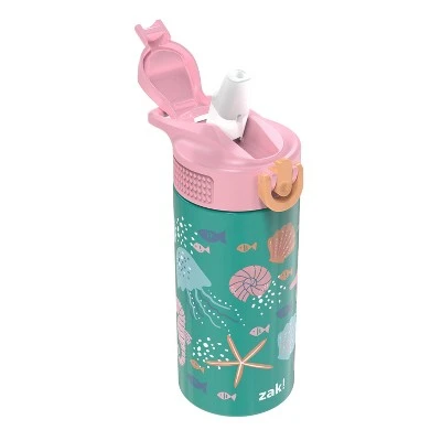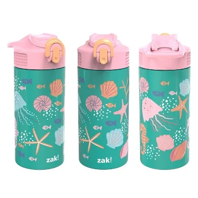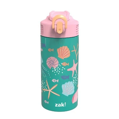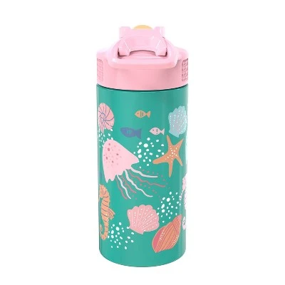 The water bottle holds 14 ounces and is made of food-grade stainless steel, durable enough for kids to take anywhere they want. It’s vacuum insulated, so cold drinks stay cold for longer and condensation won’t form on the outside of the bottle. The screw-on lid has a built-in carrying loop for easy transportation, and doesnt leak when its closed, so the bottle can be tossed into a bag for worry-free travel. When its not being used, the comfortable silicone spout can be covered to keep it clean, with a button that easily opens it and a lock to keep it shut. The bottle should be washed by hand to preserve the vacuum seal and keep the artwork bold and bright, though the lid can be washed in the top rack of the dishwasher. Do not microwave.